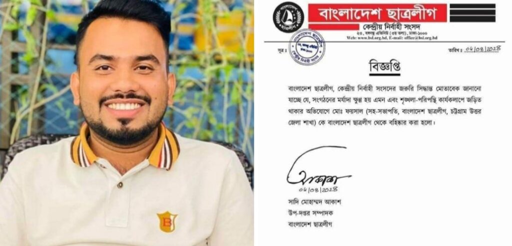 বিজ্ঞপ্তিতে বলা হয়েছে সংগঠনের মর্যাদা ক্ষুণ্ন হয় এমন এবং শৃঙ্খলা পরিপন্থি কার্যকলাপে জড়িত থাকার অভিযোগে চট্টগ্রাম উত্তর জেলা ছাত্রলীগের সহ সভাপতি মো. ফয়সালকে ছাত্রলীগ থেকে বহিষ্কার করা হলো।